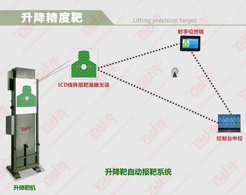 本靶机功能可满足精度射击、隐显射击、应用射击、3331反恐射击等训练科目要求。采用嵌入式单片机计算机控制器,实现对整个系统的控制。应用数据库技术,实现对训练成绩的自动存储、统计分析等处理;射击命中时间的实时显示;能够实现语音报靶、成绩自动保存并能随时进行查询。该系统由计算机有线控制系统和无线遥控器控制系统组成,具有抗干扰性、性能可靠、操作简便等优点。
